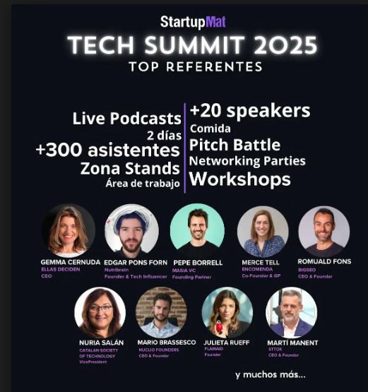EVENTO MATARÓ ? Llega el StartupMAT Tech Summit 2025 los días 28 y 29 de mayo en el Tecnocampus de Mataró. ? Speakers: - Pepe Borrell – Fundador de Crowdcube - Mercè Tell – Cofundadora de Encomenda - Romuald