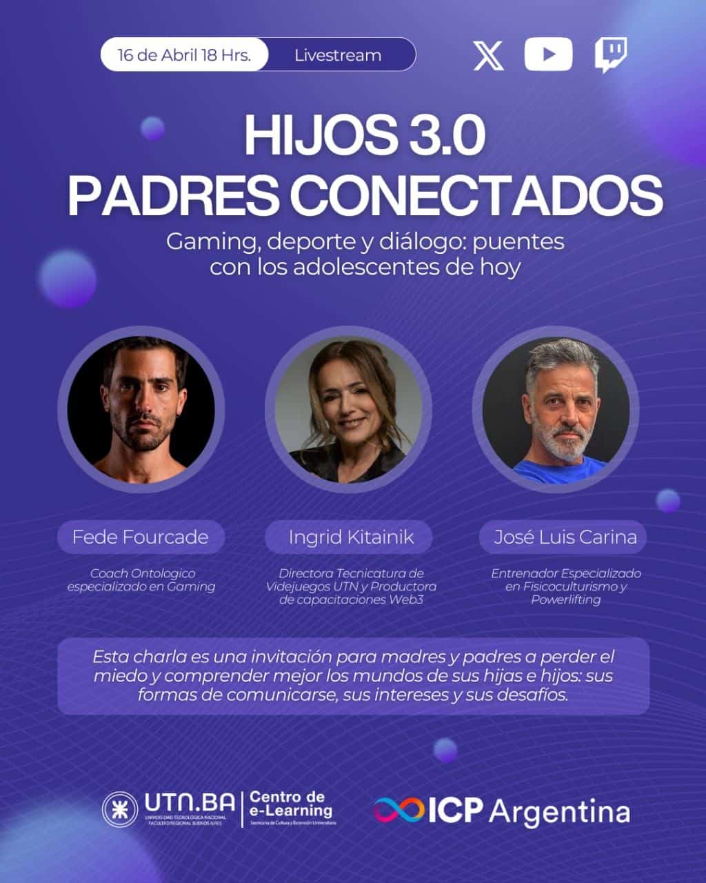 Gaming, deporte y diálogo: Puentes para entender a lxs adolescentes de hoy ? 16 de abril - 23 hs ??Españay ? En vivo por X, YouTube y Twitch – ICP Argentina Impartido por la C4E-Friend Ingrid Ka HIJOS 3.0 |